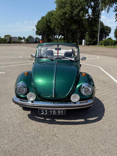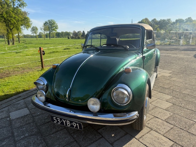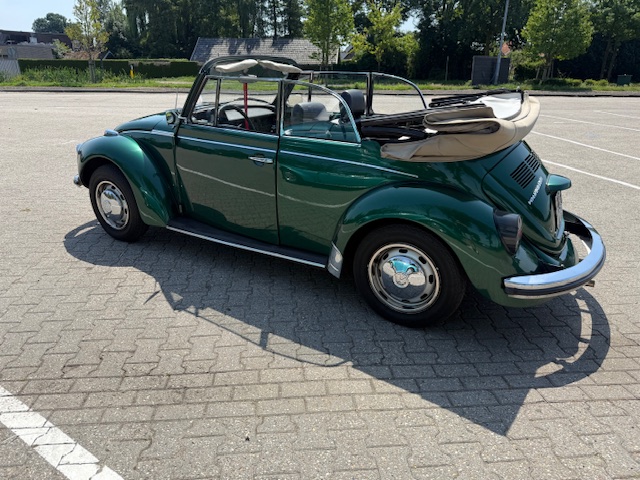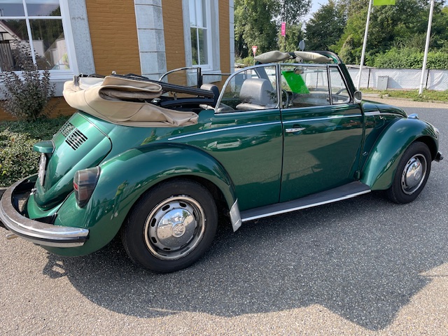 Kever Cabrio Groen Huren voor elke gelegenheid. Deze originele Duitse Volkswagen Kever Cabrio uit 1974 biedt plaats aan 4 personen en is voorzien van een PVC Dak wat natuurlijk open en dicht kan. De 16oo motor zorgt voor een soepele luchtgekoelde rit.